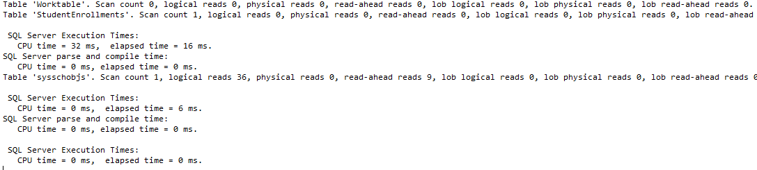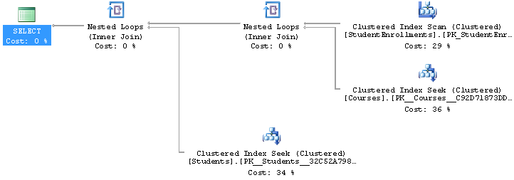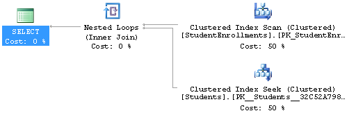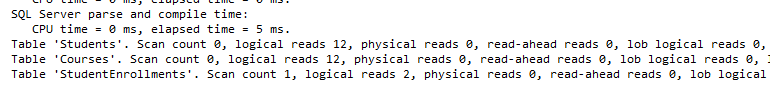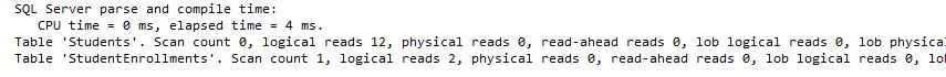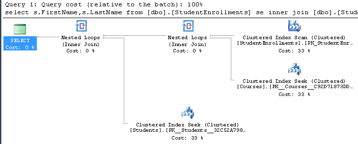 set statistics io on set statistics time on select s.FirstName,s.LastName from [dbo].[StudentEnrollments] se inner join [dbo].[Students] s on se.StudentID = s.StudentID inner join [dbo].[Courses] c on se.CourseID = c.CourseID ; |