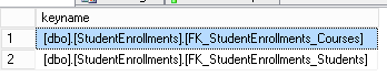 Alter table [dbo].[StudentEnrollments] check constraint [FK_StudentEnrollments_Students]; Alter table [dbo].[StudentEnrollments] check constraint [FK_StudentEnrollments_Courses]; |