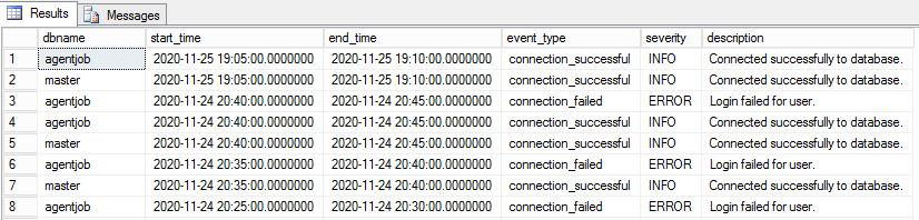 12345678910111213141516SELECTdatabase_name dbname,start_time ,end_time,event_type,CASE SeverityWHEN 0 THEN 'INFO'WHEN 1 THEN 'WARN'WHEN 2 THEN 'ERROR'ELSE 'NA'END severity,descriptionFROMsys.event_logORDER BYend_time DESC