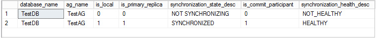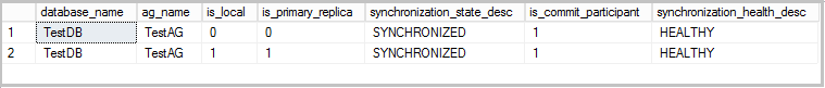 123456789101112SELECT sadc.database_name,ag.name AS ag_name,dhrs.is_local,dhrs.is_primary_replica,dhrs.synchronization_state_desc,dhrs.is_commit_participant,dhrs.synchronization_health_descFROM sys.dm_hadr_database_replica_states AS dhrsINNER JOIN sys.availability_databases_cluster AS sadc ON dhrs.group_id = sadc.group_id AND dhrs.group_database_id = sadc.group_database_idINNER JOIN sys.availability_groups AS ag ON ag.group_id = dhrs.group_idINNER JOIN sys.availability_replicas AS sar ON dhrs.group_id = sar.group_idAND dhrs.replica_id = sar.replica_id;