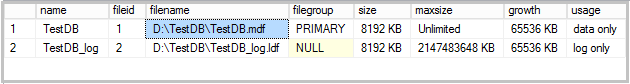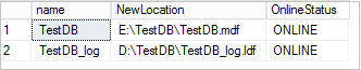 SELECT name, physical_name AS NewLocation, state_desc AS OnlineStatus FROM sys.master_files WHERE database_id = DB_ID(N'TestDB') GO |