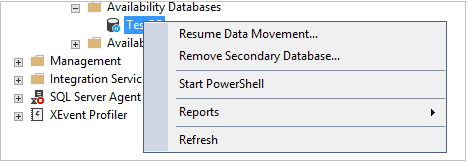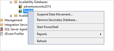Step 1: Connect to the secondary replica and go to Always On High Availability. Expand the High Availability. Right-click on the database and suspend the data movement.
