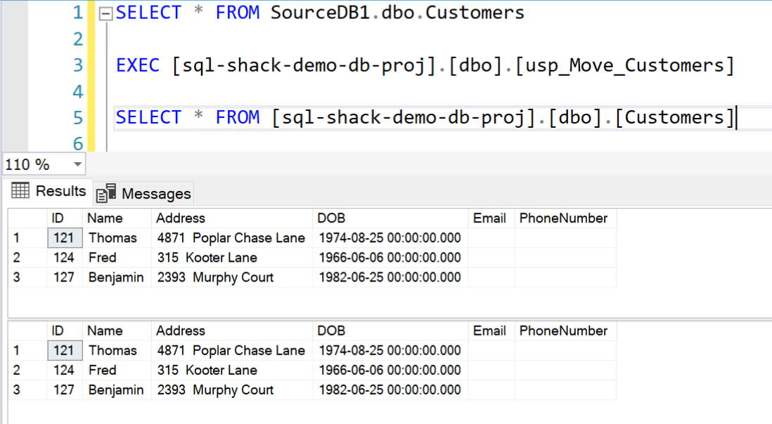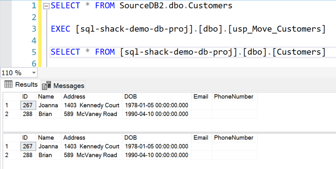 If you execute this procedure now, you can see that all the data from the SourceDB1 is being fetched and inserted into the database project.