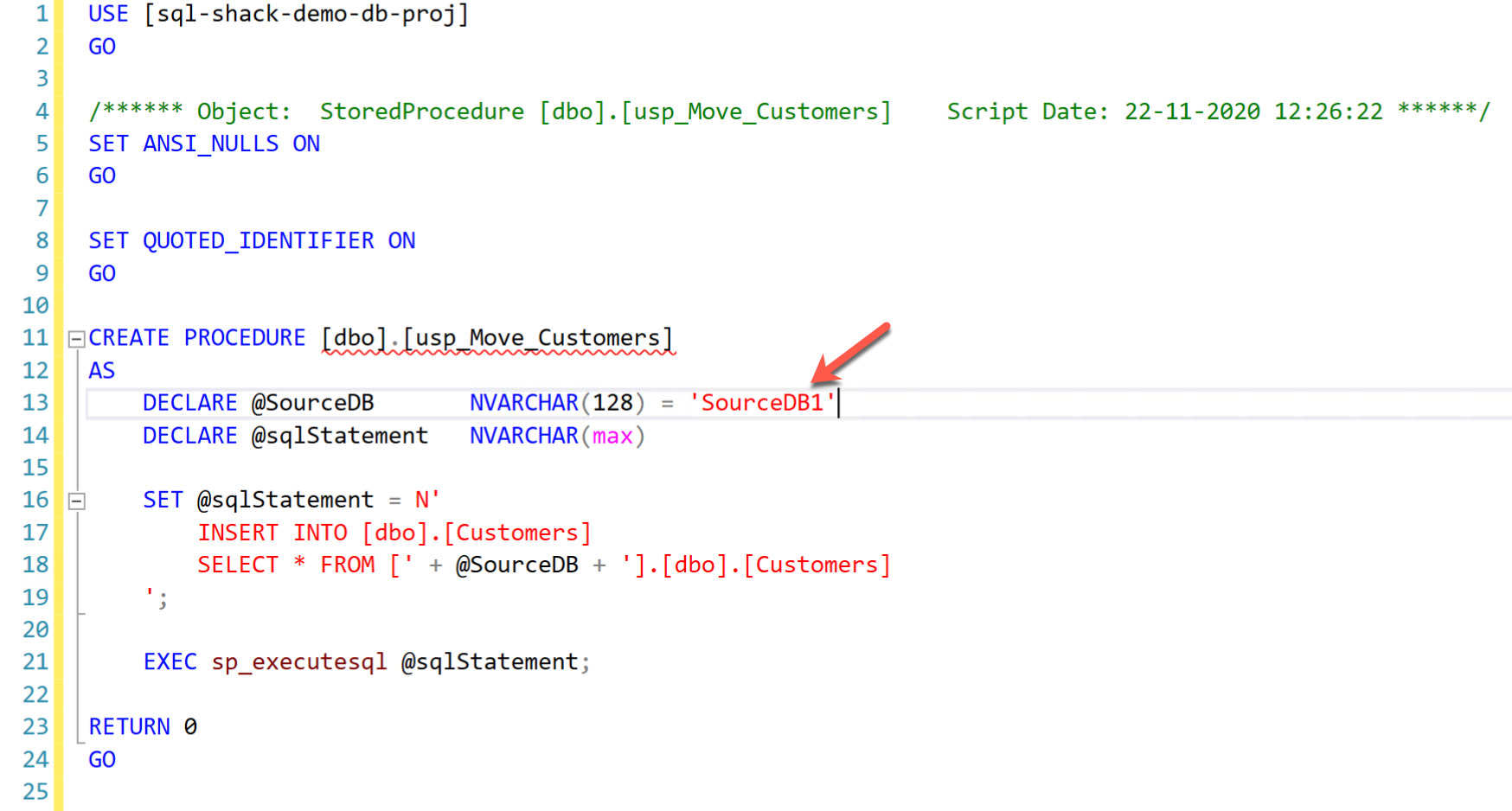 Use the script below to create the stored procedure. As you can see, we are using a special method to declare and set the value for the variable ‘@SourceDB’ using ‘$(SourceDatabaseName)’. In this snippet, the value ‘$(SourceDatabaseName)’ is the SQLCMD variable that we will be defining shortly. Also, notice how the entire SQL statement is wrapped inside a dynamic SQL statement which can be used to specify values during the deployment.