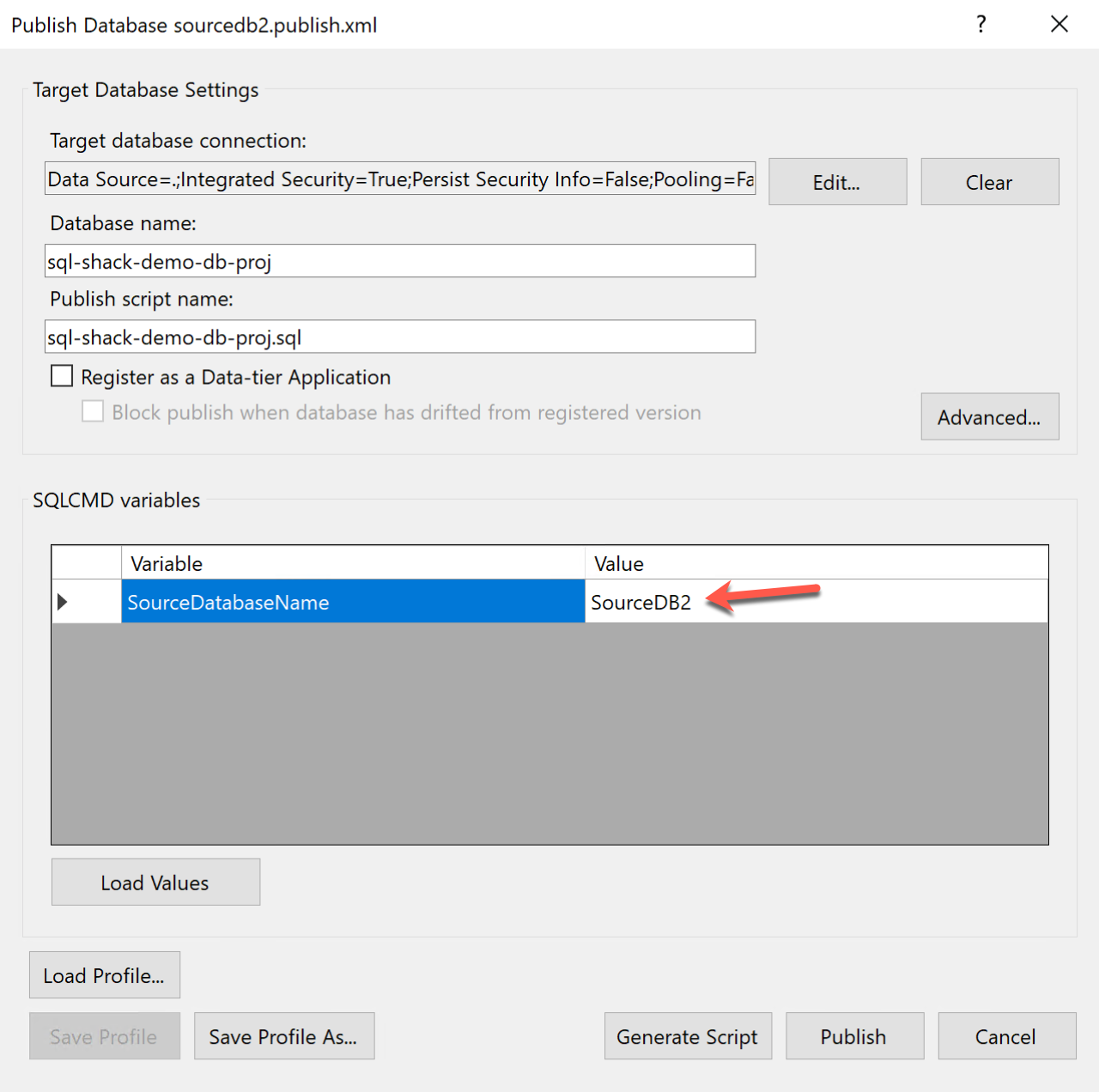 If you want to fetch data from the SourceDB2, simply modify the variable property and then re-deploy the project. In this way, you can leverage the functionality of the SQLCMD variables and assign dynamic variables to your data-tier application.