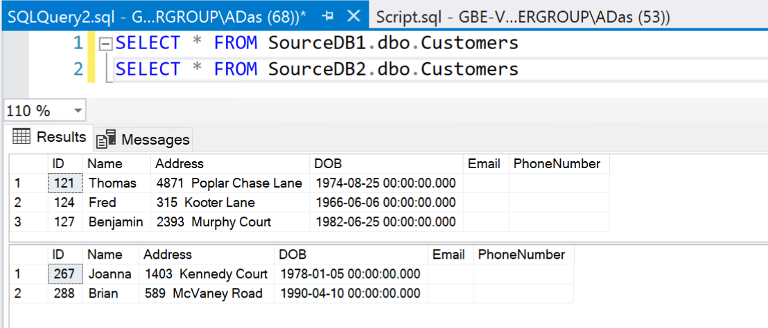 Once you execute the script above, you will see that there are two databases created with the names “SourceDB1” and “SourceDB2“. And there are a few dummy records inserted into the tables within these two databases.