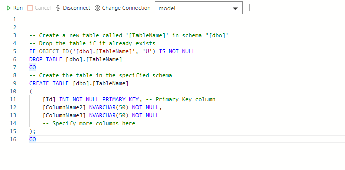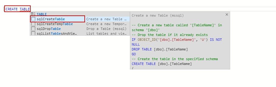 Azure Data Studio is a new lightweight tool that enables us to execute queries on-premises or cloud databases and it also helps to manage databases. Code Snippets is one of the main advantages of the Azure Data Studio, these templates assist us in typing queries to generate proper syntax easily. After opening a new query window, we type “CREATE TABLE” to create a SQL table and select the sqlCreateTable snippet.