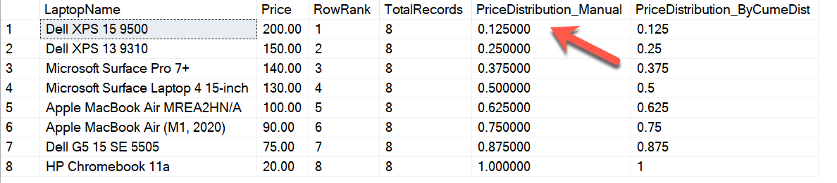 SELECT LaptopName, Price ,RANK() OVER(ORDER BY Price) AS RowRank ,8 AS TotalRecords ,RANK() OVER(ORDER BY Price)/8.0000 AS PriceDistribution_Manual ,CUME_DIST() OVER(ORDER BY Price) AS PriceDistribution_ByCumeDist FROM [dbo].[Laptops] |