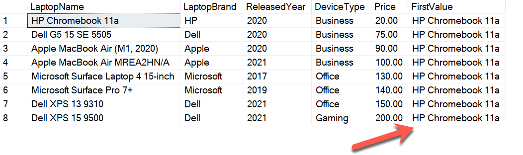 SELECT LaptopName, LaptopBrand, ReleasedYear, DeviceType, Price, FIRST_VALUE(LaptopName) OVER(ORDER BY Price) AS FirstValue FROM [dbo].[Laptops] |