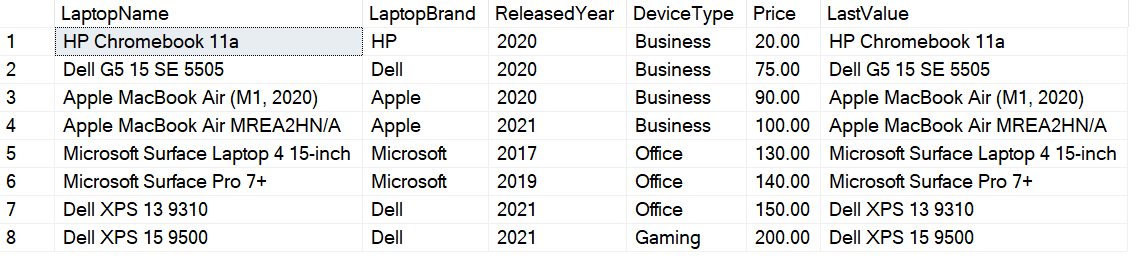 SELECT LaptopName, LaptopBrand, ReleasedYear, DeviceType, Price, LAST_VALUE(LaptopName) OVER(ORDER BY Price ROWS BETWEEN UNBOUNDED PRECEDING AND UNBOUNDED FOLLOWING) AS LastValue FROM [dbo].[Laptops] |