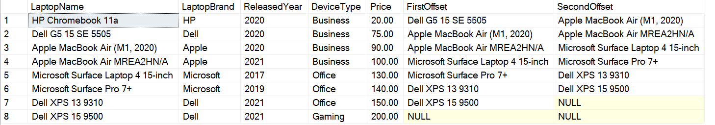 SELECT LaptopName, LaptopBrand, ReleasedYear, DeviceType, Price, LEAD(LaptopName,1) OVER(ORDER BY Price) AS FirstOffset, LEAD(LaptopName,2) OVER(ORDER BY Price) AS SecondOffset FROM [dbo].[Laptops] |