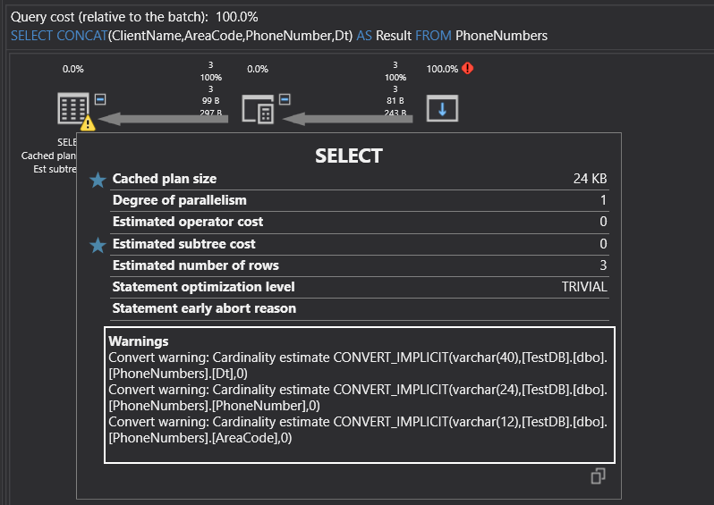 As we mentioned above, there is a warning sign shown on the SELECT operator in the execution plan. The reason for this sign is that if we use any non-character parameters in the CONCAT function, these parameters will be converted into the string data type automatically by SQL Server. Then the string combining operation will be performed. Now, we will reinforce this theoretical information with an example: