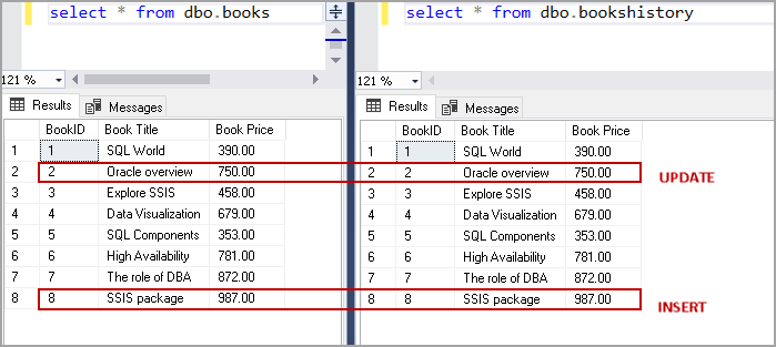 UPDATE dbo.books SET [Book Price] = 750 WHERE BookID = 2; go Insert into dbo.books values (8,'SSIS package',987) |