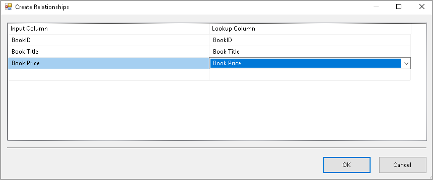 In the mapping, create the mapping for the input and Lookup column. You can right-click on the mapping screen and create Relationships for all columns similar to the following.