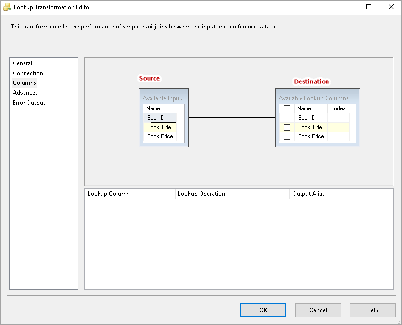 Click on the Columns, and it shows the source and destination table. We want to compare the BookID columns on both tables. Drag on the BookID column from the source and move it to the destination BookID column. It draws an arrow, as shown in the following image.
