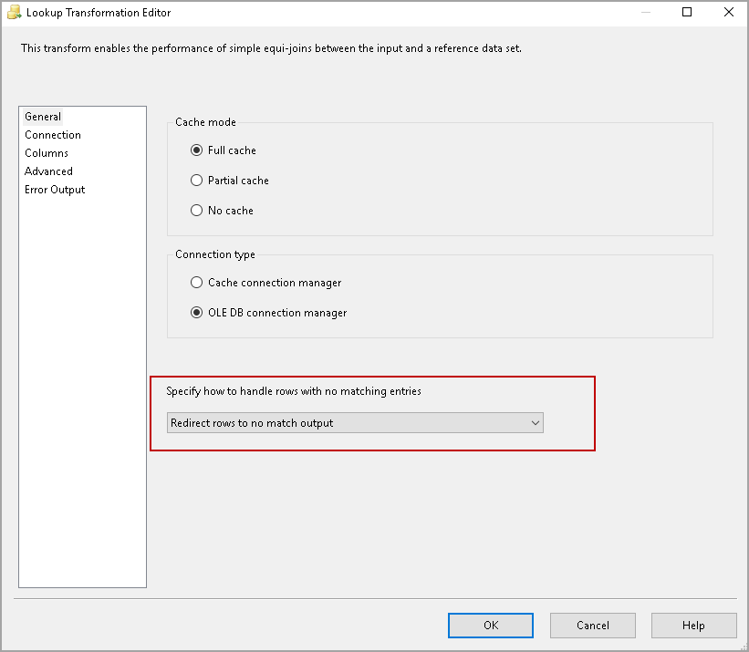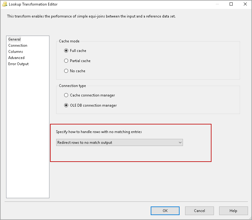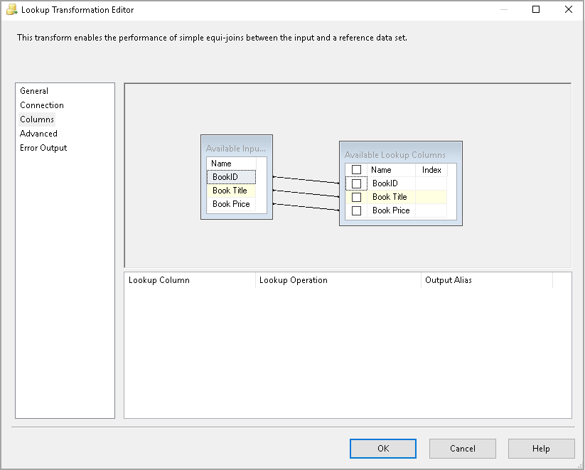 In Lookup Transformation Editor, We specify the connection manager and cache type. These details are outside the scope of this article and for now we will go with the default values of these.