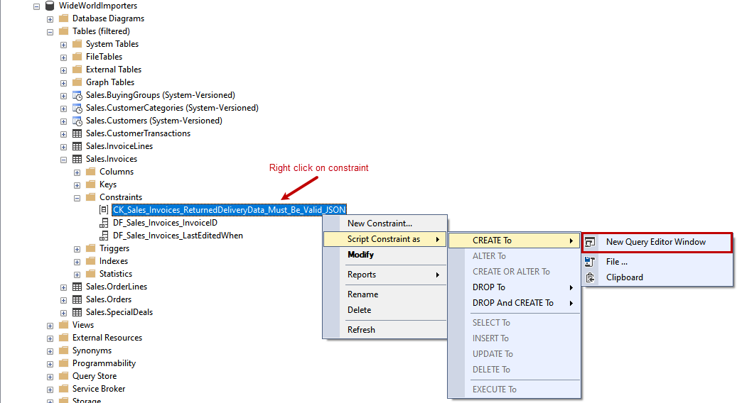 The steps to generate the T-SQL definition of the check constraint are different. To generate the definition of the check constraint named [CK_Sales_Invoices_ReturnedDeliveryData_Must_Be_Valid_JSON] created on [Sales].[Invoices] table, Expand Wideworldimportors Expand Tables Expand Sales.Invoices Expand Constraints Right-click on [CK_Sales_Invoices_ReturnedDeliveryData_Must_Be_Valid_JSON] Script constraint as Create To New Query Editor Window.