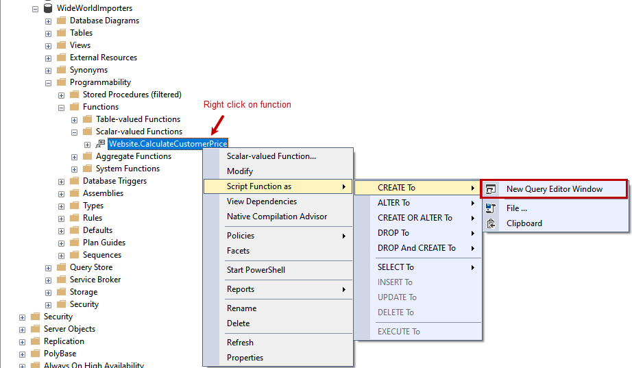 The steps to generate the T-SQL definition of the function are the same as the steps used in the stored procedure. To generate the definition, expand programmability expand functions expand user-defined function right-click on Website.CalculateCustomerPrice Hover on Script Function as Hover on Create To Click New Query Editor Window.