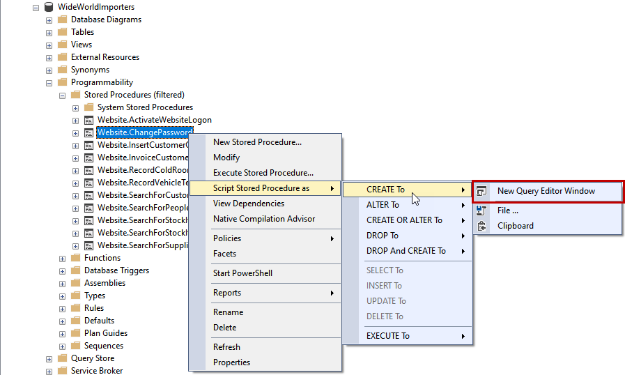 To generate the T-SQL definition of the Website.ChangePassword stored procedure, Open SSMS and connect to the database engine Expand Wideworldimportors database expand programmability right-click on Website.ChangePassword Hover on Script Stored Procedure as Hover on Create To Click on New Query Editor Window.