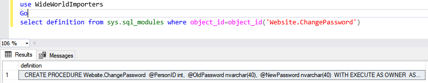 As I mentioned at the beginning of the article, the helptext statement populates the definition of the object from the sys.sql_modules, so we can run the SELECT statement on the DMV to populate the T-SQL definition. Suppose you want to populate the T-SQL query of the Website.ChangePassword stored procedure. Run the following query.