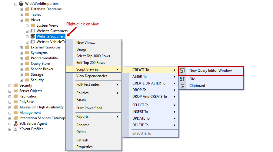 To generate the definition of the [Website].[Suppliers] view, Expand Wideworldimportors database expand views Right-click on [Website].[Suppliers] Hover on Script view as hover on Create To New query editor window.