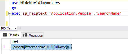 use WideWorldImporters Go exec sp_helptext 'Application.people','SearchName' |