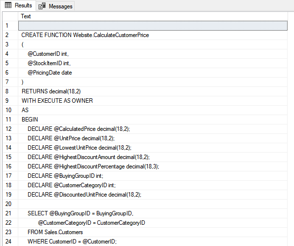 A user-defined, scalar function named named [Website].[CalculateCustomerPrice] has been created in the wideworldimportors database. To populate the definition of the [Website].[CalculateCustomerPrice], run the following query. I have trimmed the output screenshot because the T-SQL definition is very lengthy.