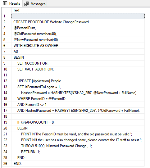 To view the definition of the Website.ChangePassword stored procedure executes the following query.