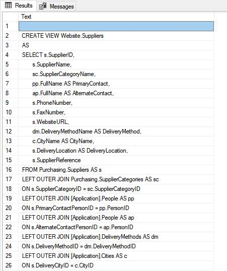 A view named [Website].[Suppliers] has been created in the wideworldimportors database. To populate the definition of the [Website].[Suppliers], run the following query.