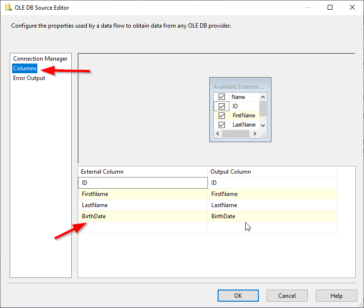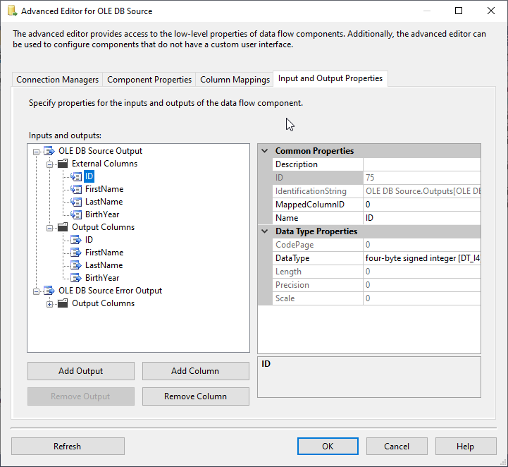 Now, let us go to the “Inputs and Outputs properties” tab. Under the OLE DB Source Output node, we will see that the source columns metadata is persisted within the OLE DB Source component. It will not automatically change once the correspondent column is changed in the source database.