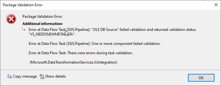 Error at Data Flow Task [SSIS.Pipeline]: “OLE DB Source” failed validation and returned validation status “VS_NEEDSNEWMETADATA”.