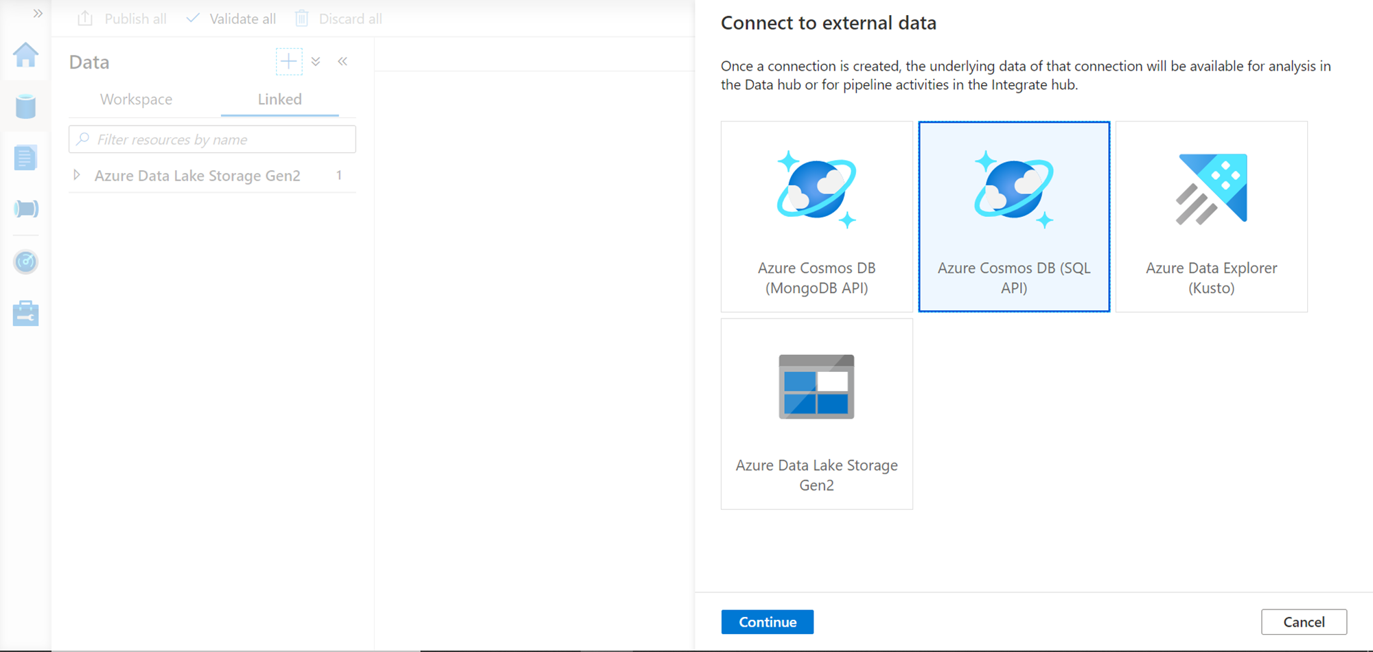 You may find various options to connect to a number of repositories. One of our interests at present is Azure Cosmos DB (SQL API) as shown below. If you have created a Cosmos DB instance using a different API than the SQL API, this option may not work. Select this option and click on the Continue button.