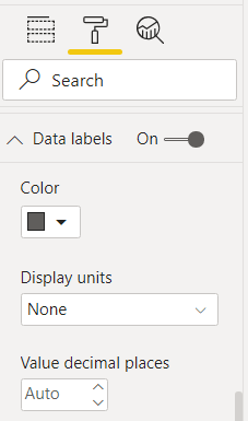 - Enable the data labels property. It shows the data labels ( values) on the chart area. Here, we choose display units as None to show actual values in the chart. We can use display units to shows values in thousands, Millions, Billions: