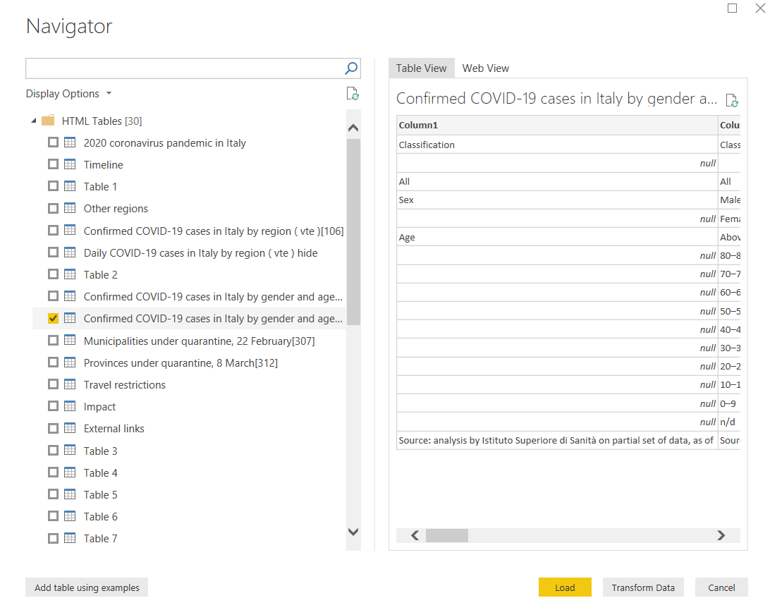 Now, we will analyze the confirmed cases in Italy by their age group. For this, we will use the same URL and import the following data table. We do not need to close the report. You can click on the get data in the ribbon bar and use Get Data -> web for it.