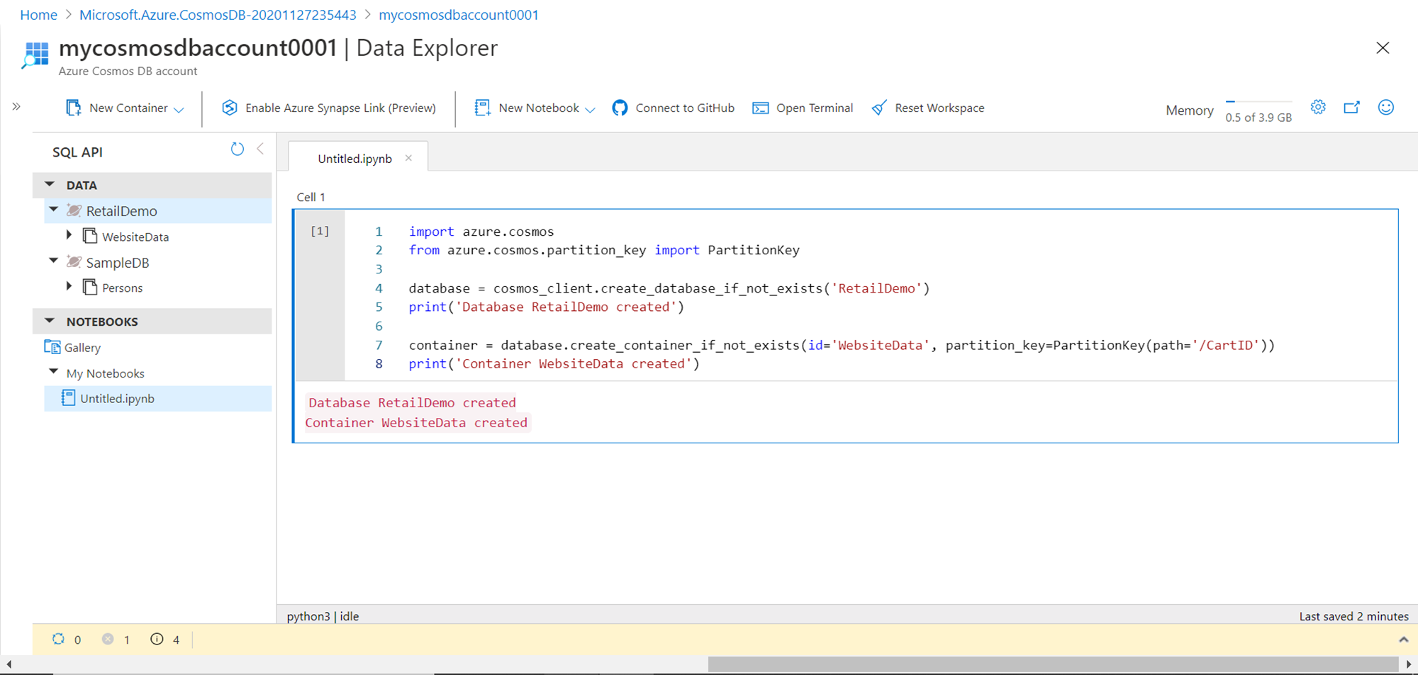 Type the code as shown below to create a new database and container. This is the first step towards creating a new sample data. In the first two lines of code, we are importing the azure.cosmos library which provides us the functions to perform the same operations on Azure Cosmos DB that are available from the console. Then we are creating a new database named “Retail Demo” and a new container named “WebsiteData”. Also, we are printing a confirmation message after the same gets created.