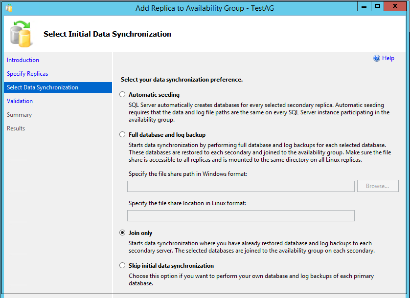 In the primary replica, expand Availability Groups and right-click on the availability replicas. Now click on Add replica. In the initial data synchronization page of SQL Server Always On Availability Group, select the JOIN ONLY data synchronization method. Primary replica holds all the transaction logs, and it should bring the secondary database to the state in sync with the primary replica.
