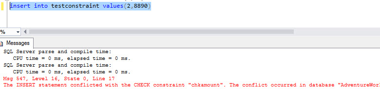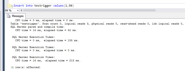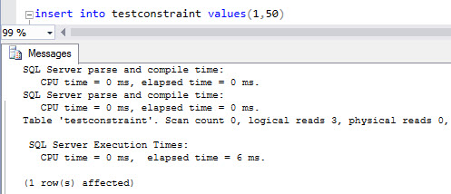 SET STATISTICS io ON SET STATISTICS time ON GO insert into testconstraint values(1,50) |