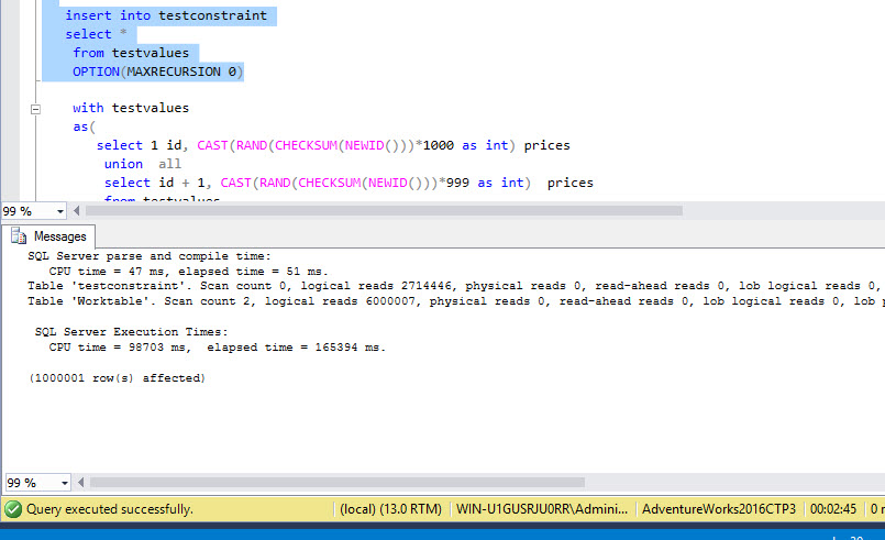 with testvalues as( select 1 id, CAST(RAND(CHECKSUM(NEWID()))*1000 as int) prices union all select id + 1, CAST(RAND(CHECKSUM(NEWID()))*999 as int) prices from testvalues where id <= 1000000 ) insert into testconstraint select * from testvalues OPTION(MAXRECURSION 0) |