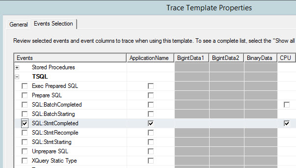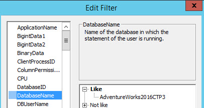 In DatabaseName, we will only trace the SQL Statements of the AdventureWorks2016TCP3 database. You can use another database of your preference. Save the trace once that the database name is specified: