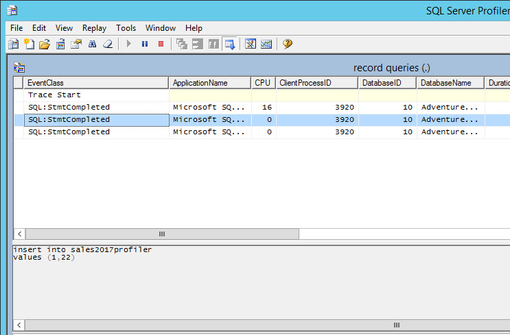 Run the trace, and to test in profiler, and in SSMS, go to Adventureworks2016CT3 Database or the database that you selected in the filter and run this statements: