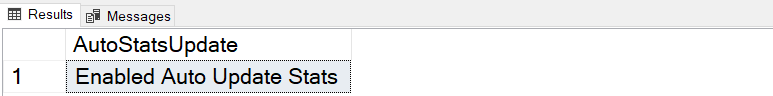 Select case is_auto_update_stats_on WHEN 0 THEN 'Disabled' WHEN 1 THEN 'Enabled Auto Update Stats' End AS AutoStatsUpdate from sys.databases where name = 'AzureDemoDatabase' |