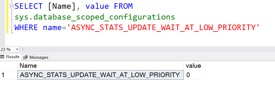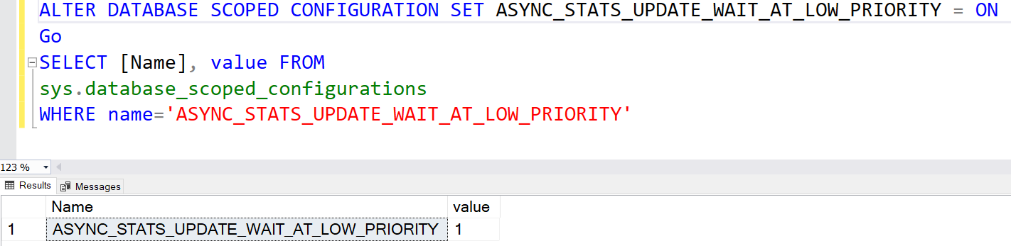 ALTER DATABASE SCOPED CONFIGURATION SET ASYNC_STATS_UPDATE_WAIT_AT_LOW_PRIORITY = ON Go SELECT [Name], value FROM sys.database_scoped_configurations WHERE name='ASYNC_STATS_UPDATE_WAIT_AT_LOW_PRIORITY' |