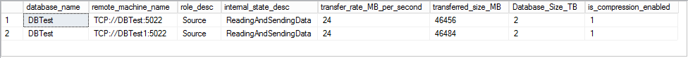 select local_database_name , remote_machine_name,role_desc ,internal_state_desc ,transfer_rate_bytes_per_second/1024/1024 as transfer_rate_MB_per_second ,transferred_size_bytes/1024/1024 as transferred_size_MB ,database_size_bytes/1024/1024/1024/1024 as Database_Size_TB, is_compression_enabled from sys.dm_hadr_physical_seeding_stats |