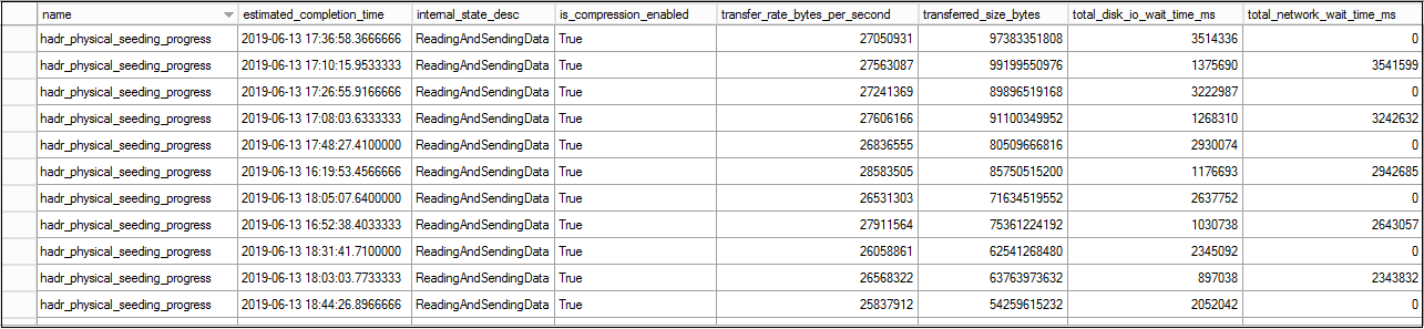 - Sys .dm_hard_physical_seeding_stats: This DMV is useful to get the current state of automatic seeding including the transfer rate, estimated completion time, database size, compression enabled or not
