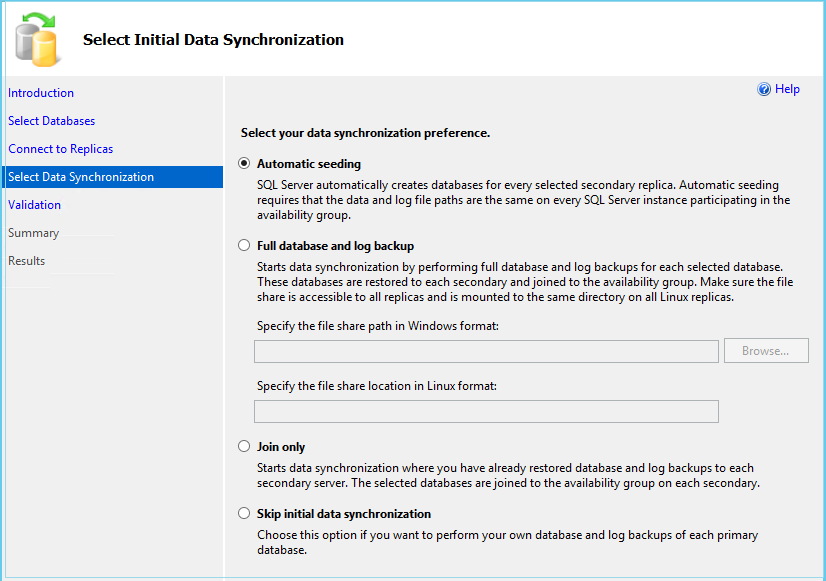 In SQL Server Always On Availability Groups, we can add a database into an existing availability group using different methods. We get the following option in the Initial Data Synchronization wizard in SSMS.