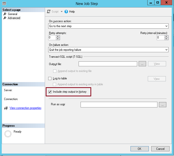 Fill fields in Task creation dialog. Don’t forget to select the “Include step output in history”. Once it’s done, click on the “OK” button