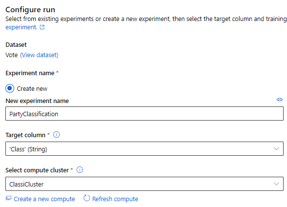 You need to provide the experiment name. In this classification problem, we need to configure the classification target column. In this example, Class is the target attribute. Please note that the class attribute indicates what is the party that each senator belongs to.