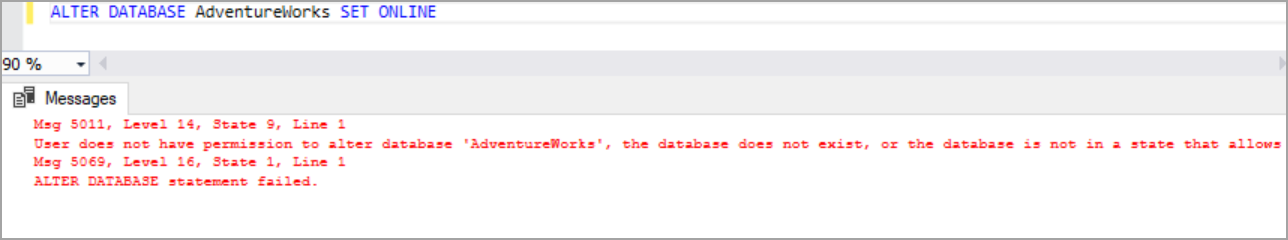 Similarly, we cannot bring the database online using T-SQL script as well.