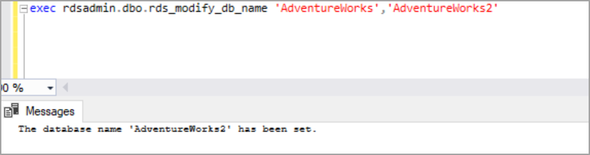 exec rdsadmin.dbo.rds_modify_db_name 'AdventureWorks','AdventureWorks2' |