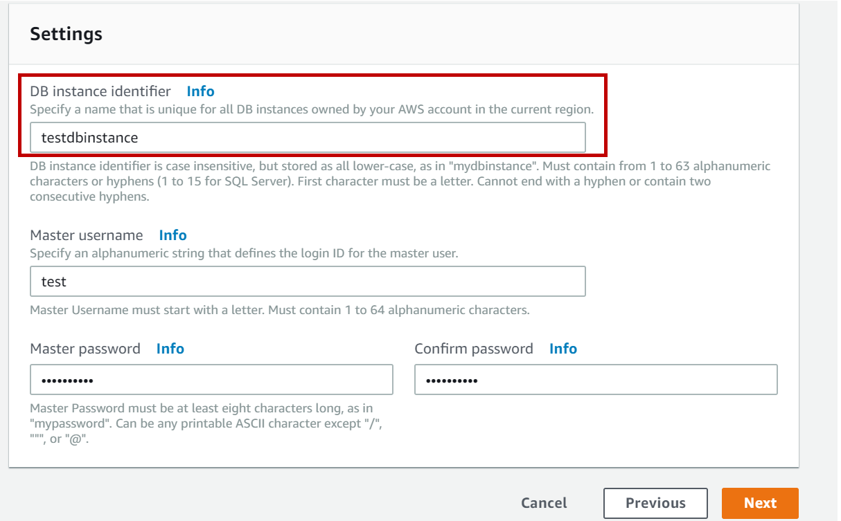 In settings section, specify the name of the DB instance identifier and this should be unique among all the instances in your AWS account in the region. Input the master username and password of your choice and click Next.